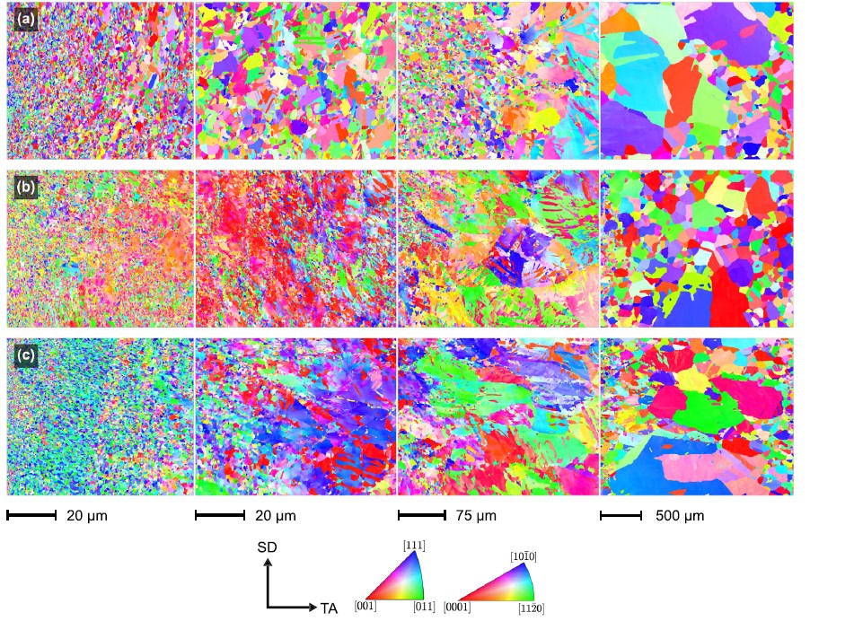 Interrupted EBSD orientation maps of FSSP-processed cobalt cross-sections, revealing morphological gradients. The leftmost image is the processing surface: (a) 2 s dwell processing condition; (b) 20 s dwell processing condition; (c) 40 s dwell processing condition. Scale bars are for each column of data.