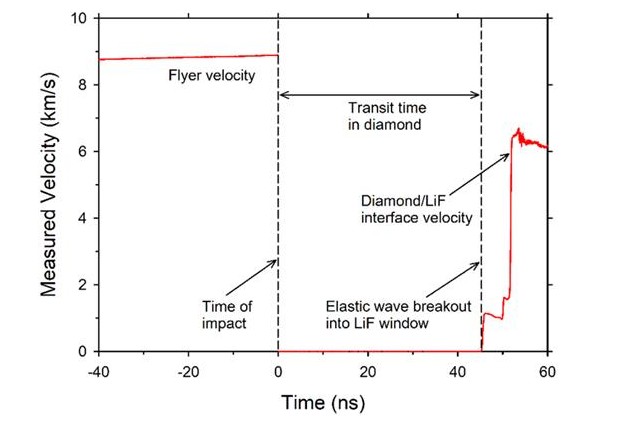 Representative results for plate impact experiments at the Sandia Z facility on diamond single crystals backed by a LiF window. Laser interferometry results from experiment Z3435—N7 show the flyer velocity up until impact, loss of signal upon impact with the diamond sample, and arrival of the shock wave at the diamond/LiF interface. The measured diamond/LiF interface velocity indicates a two-wave structured shock.